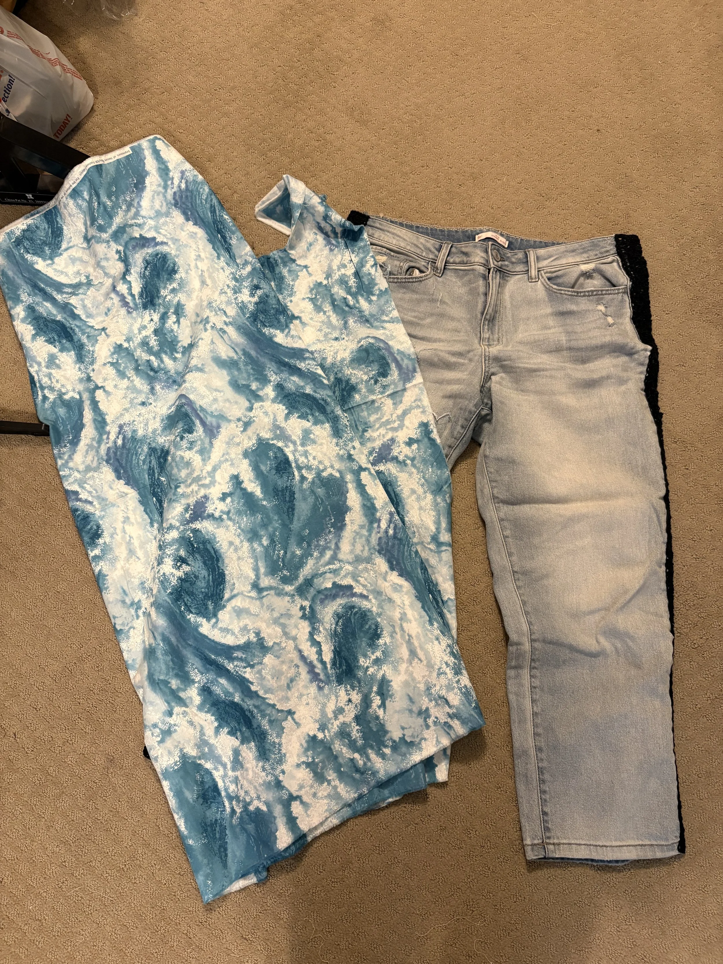 As long as the client provided their own materials - the weathered jeans, and the 1.5 yards (minimum) of printed cotton, I think I would conservatively quote them a minimum of $45… again, that’s only if they can bring me their own materials.
