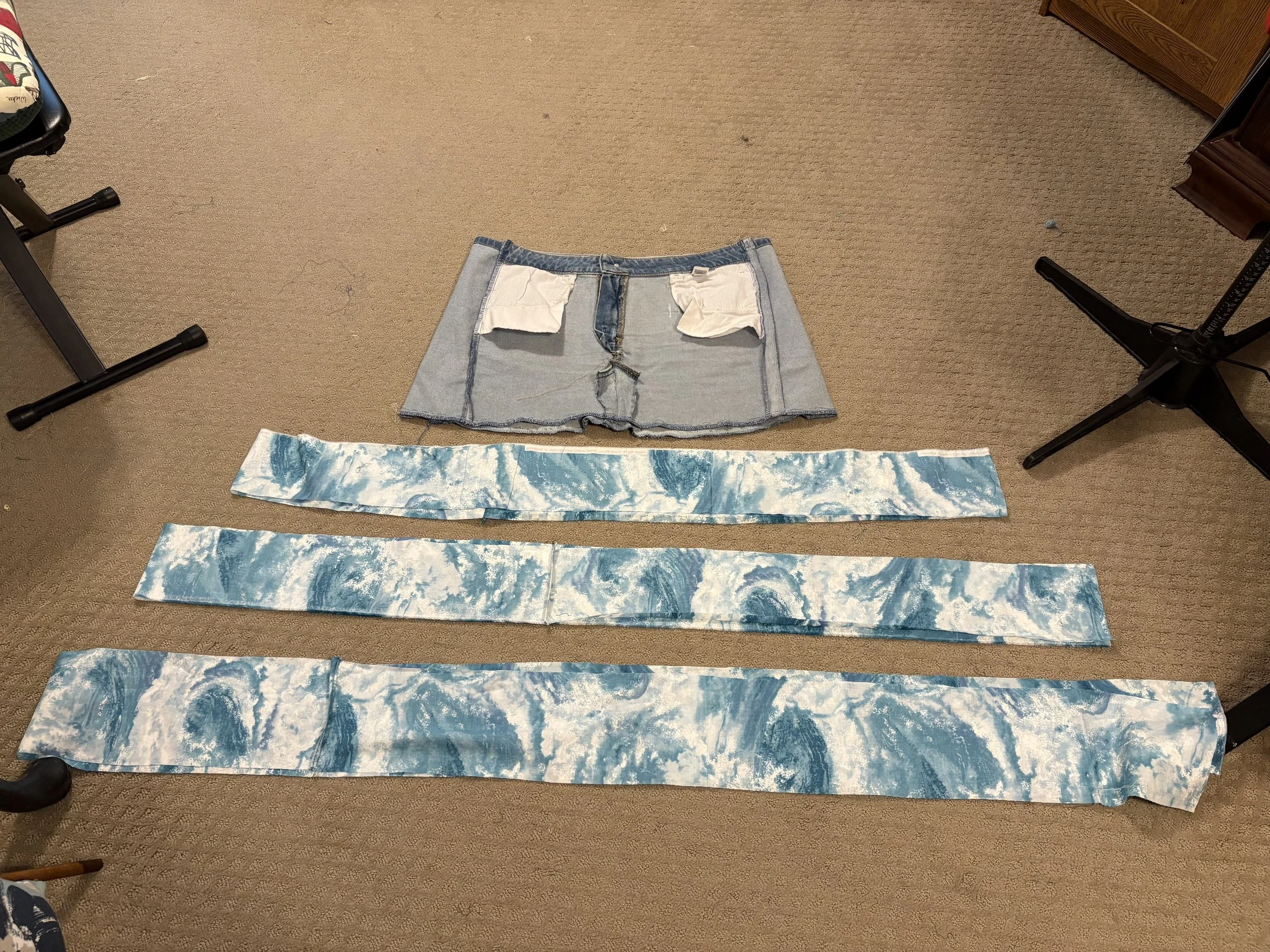 The only downside with this method of experimentation is that now I have several strips of cotton and no idea what to do with any of them. Although, there may be a way to incorporate them into the rest of the skirt, or combine them what’s left of the denim legs to make a matching purse or tote.