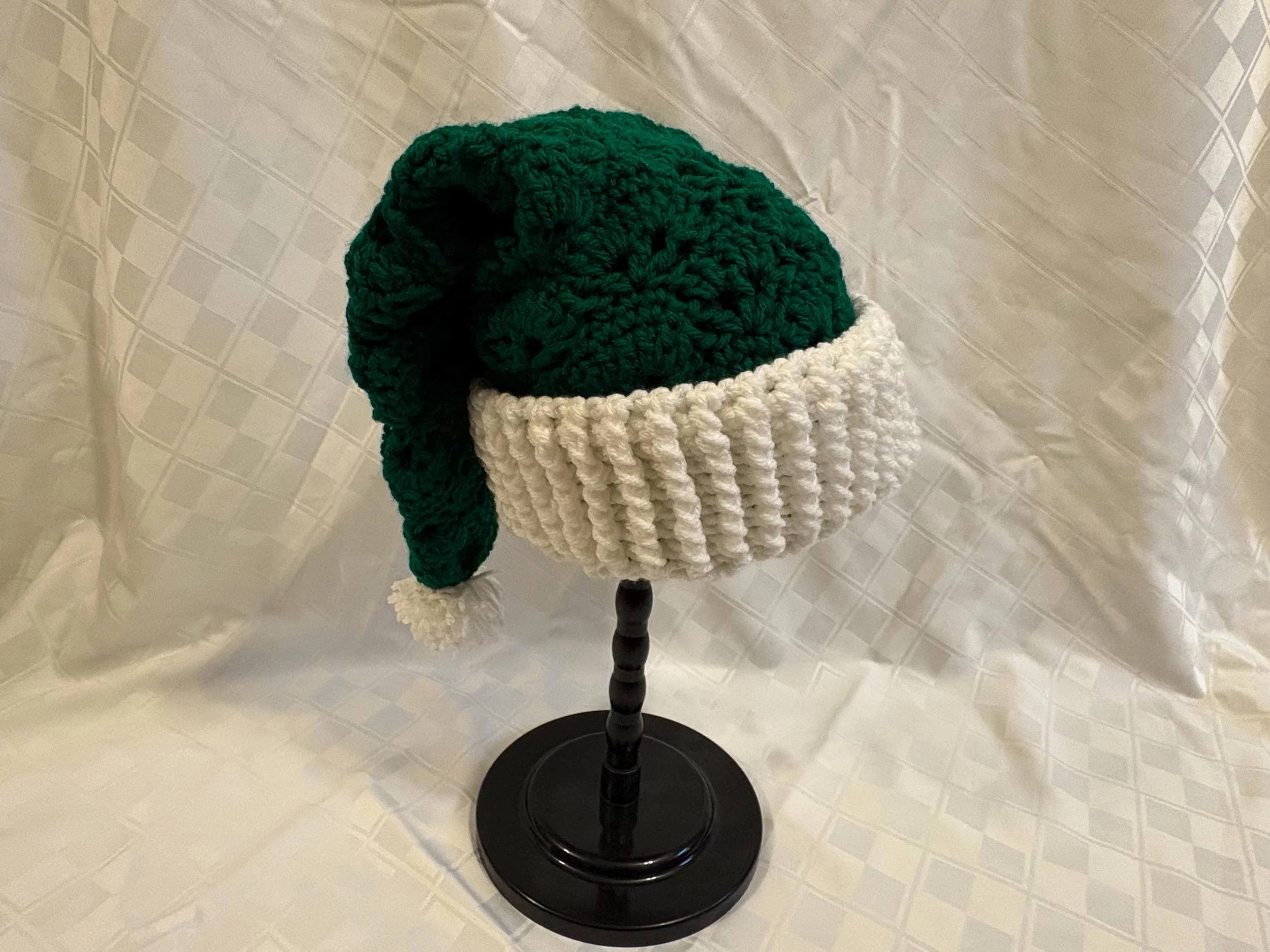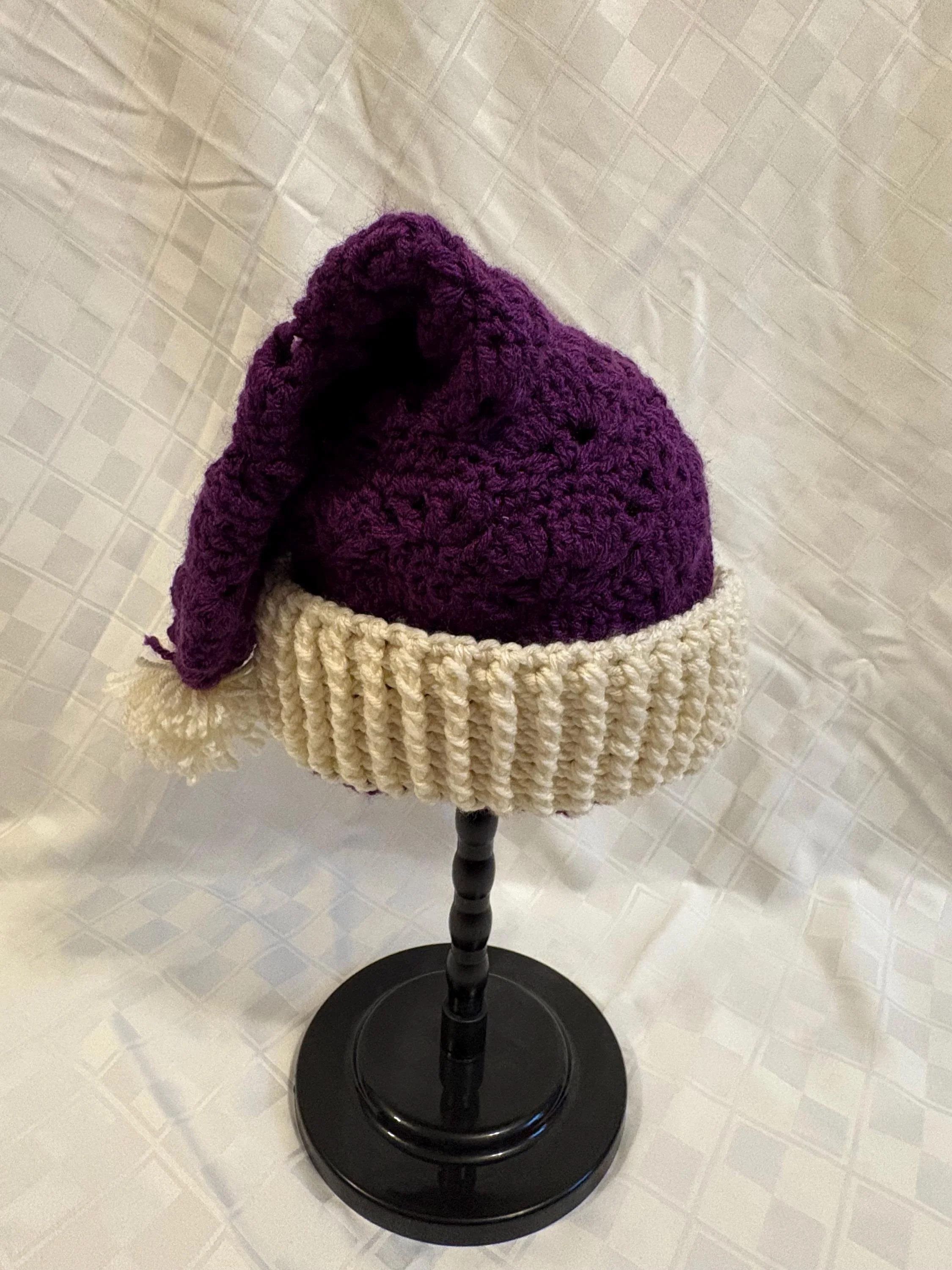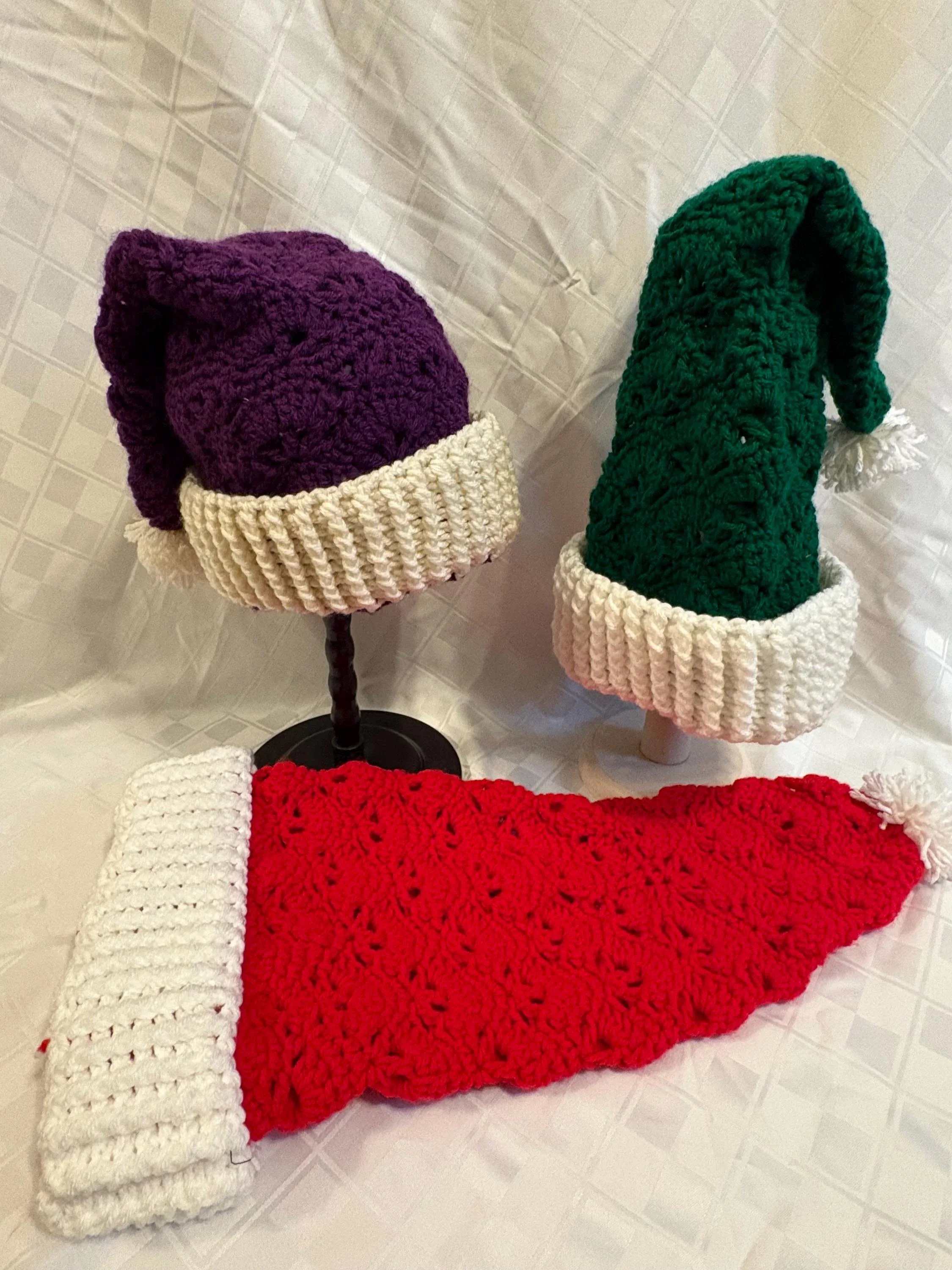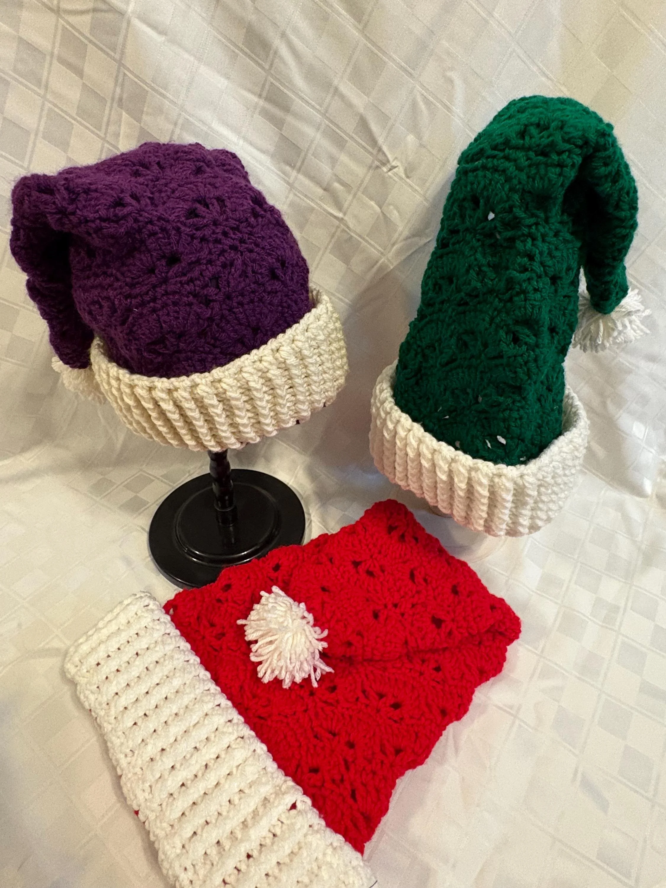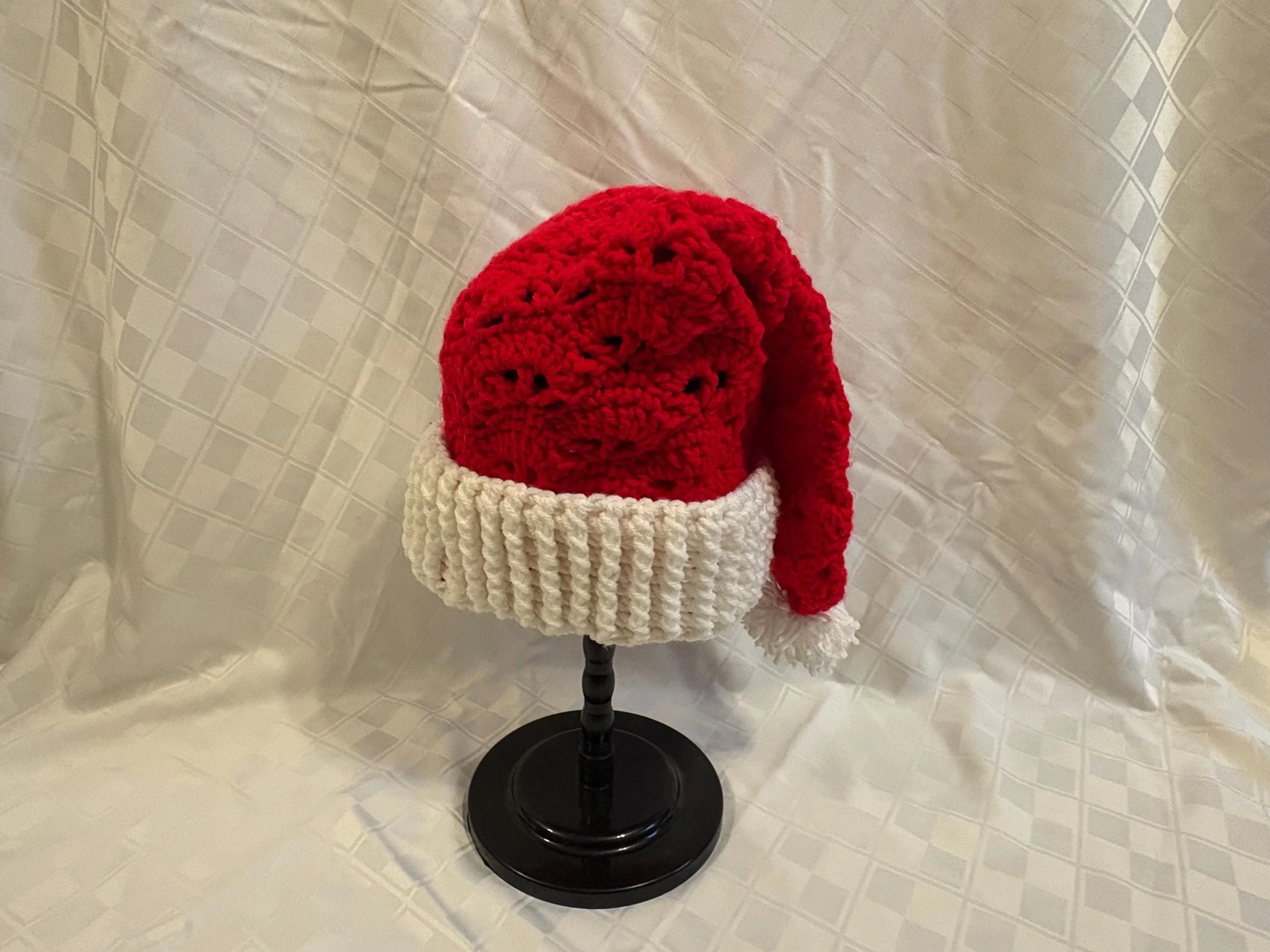 Welcome Santa Claus in style with a vintage-inspired hat! Using a modified open-fan stitch pattern, and posting to create the brim, these hats will warm your holiday spirit (figuratively and literally!). Each comes with a handmade, matching pompom for just a touch of extra whimsy.