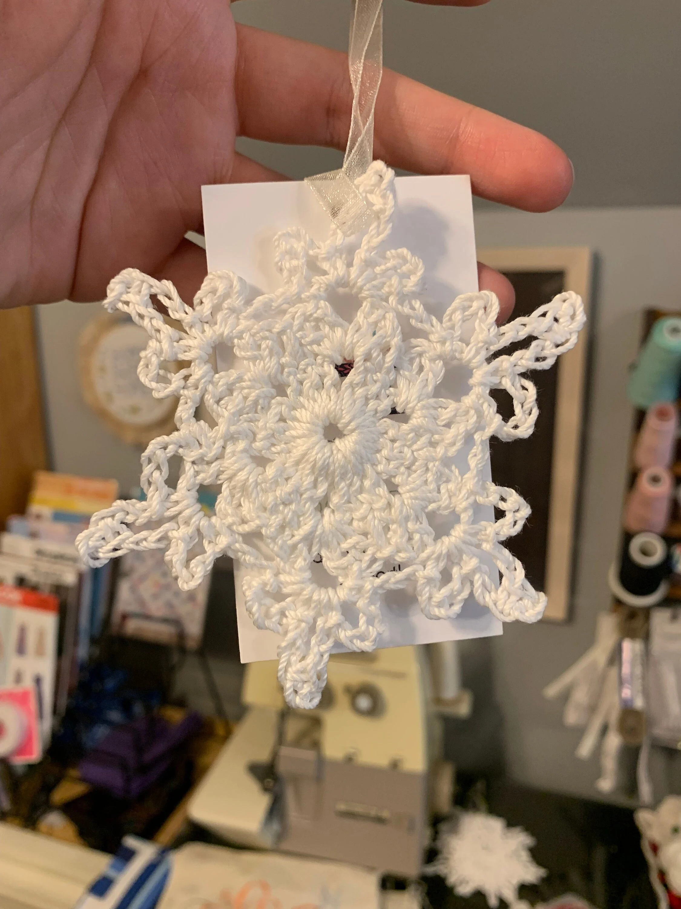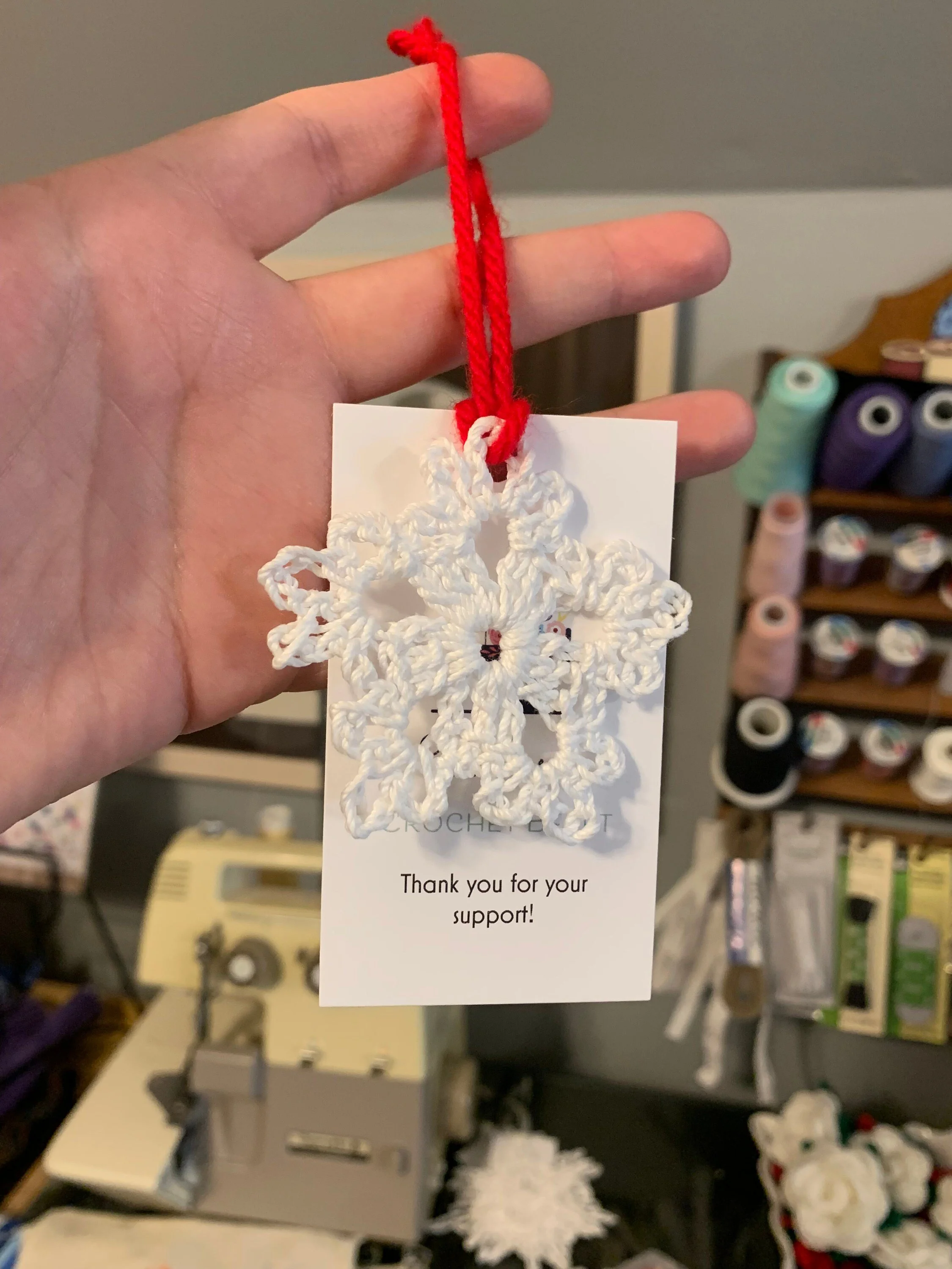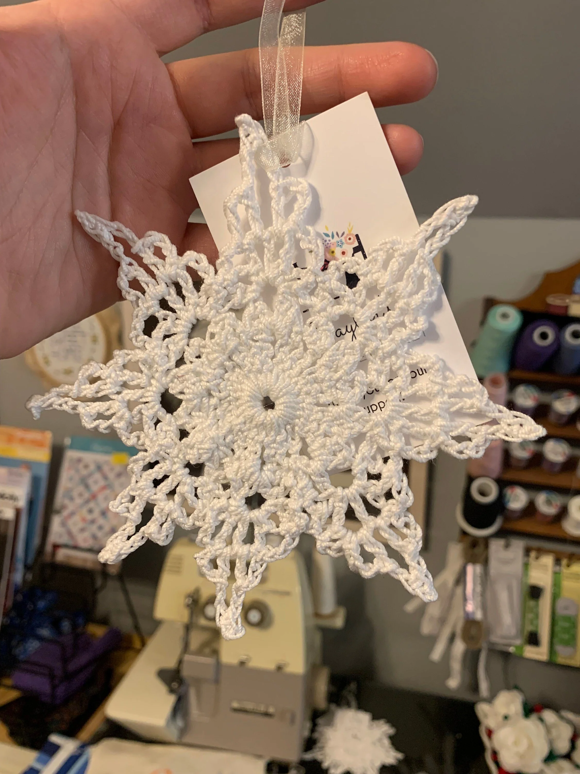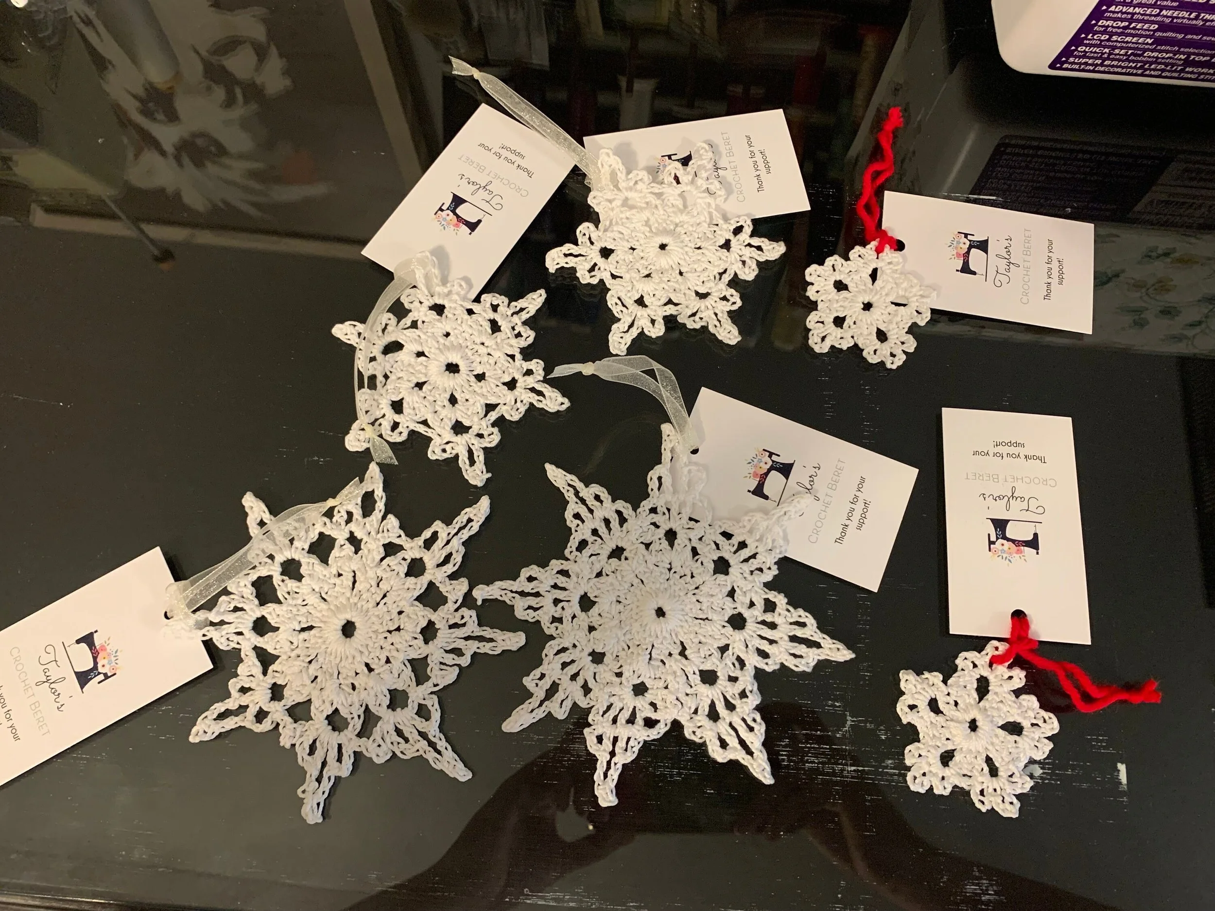 Add a delicate touch to the holidays with these crocheted snowflakes hanging on the tree! Made from white crochet thread and then stiffened to retain their shape. Three sizes currently available: