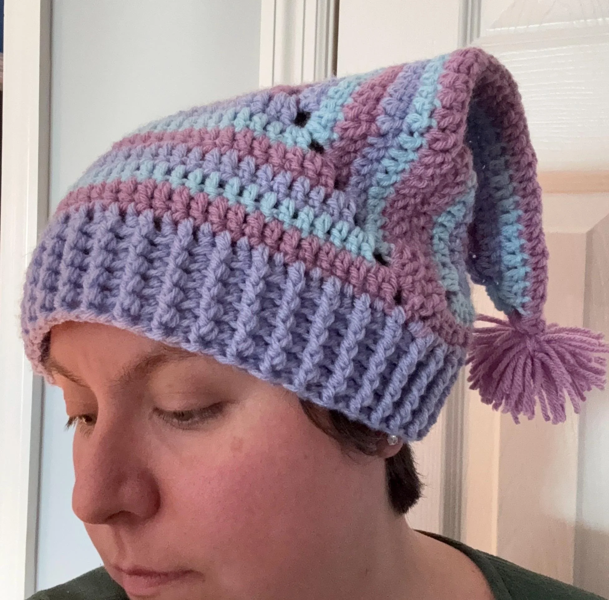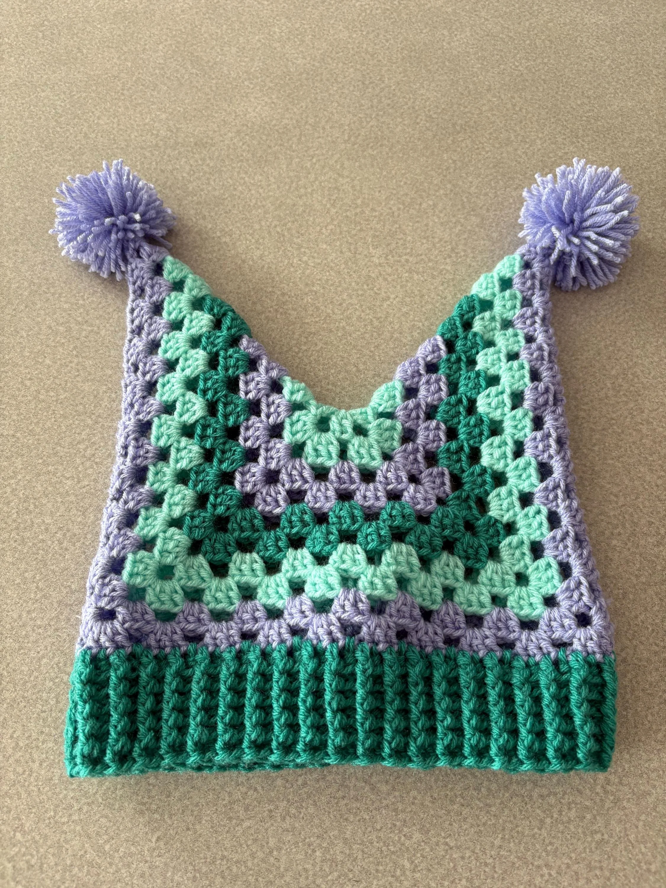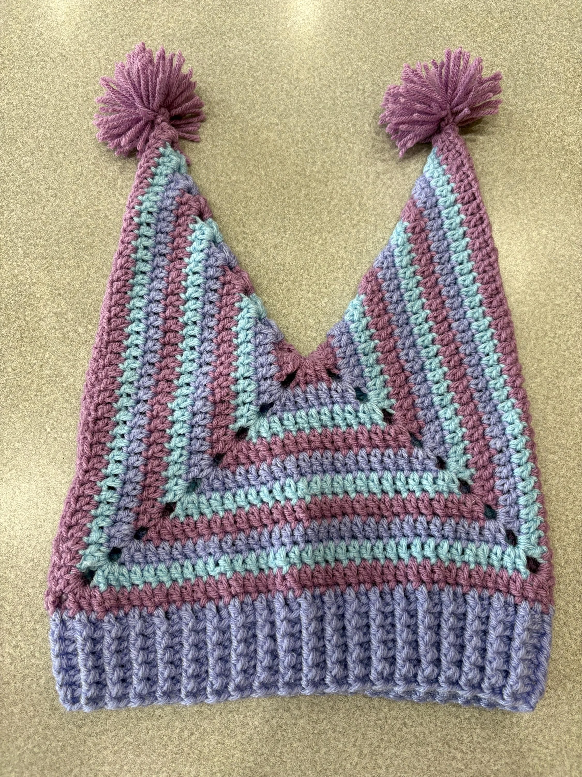 Each hat utilizes a different combination of colors and stitch patterns, making each one unique; customization is also available if you're looking for something in particular! To order a personalized hat, please select the "Custom Made" option and then list your hat's design features (for example: color, stripe pattern, pompoms, etc.)