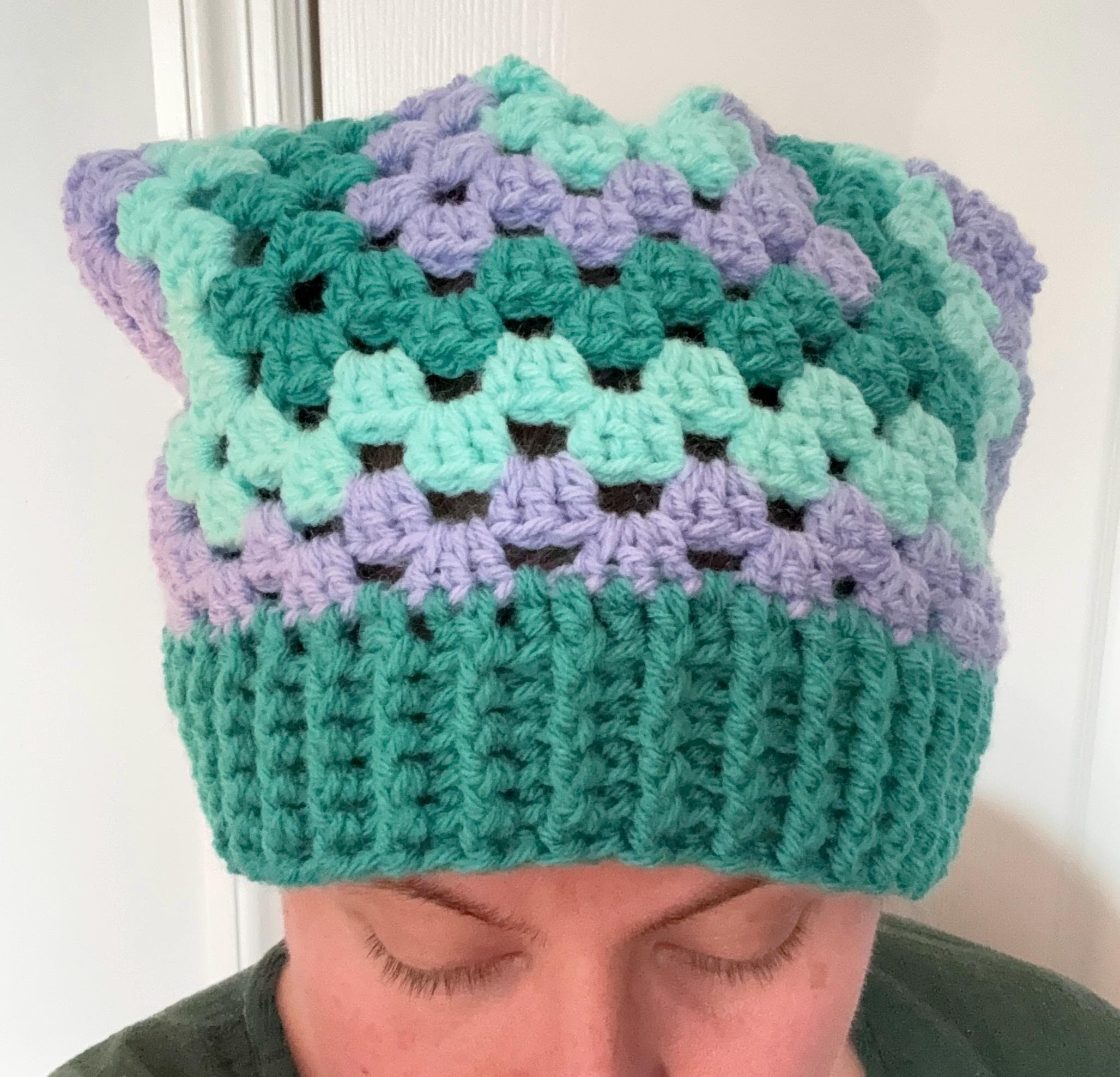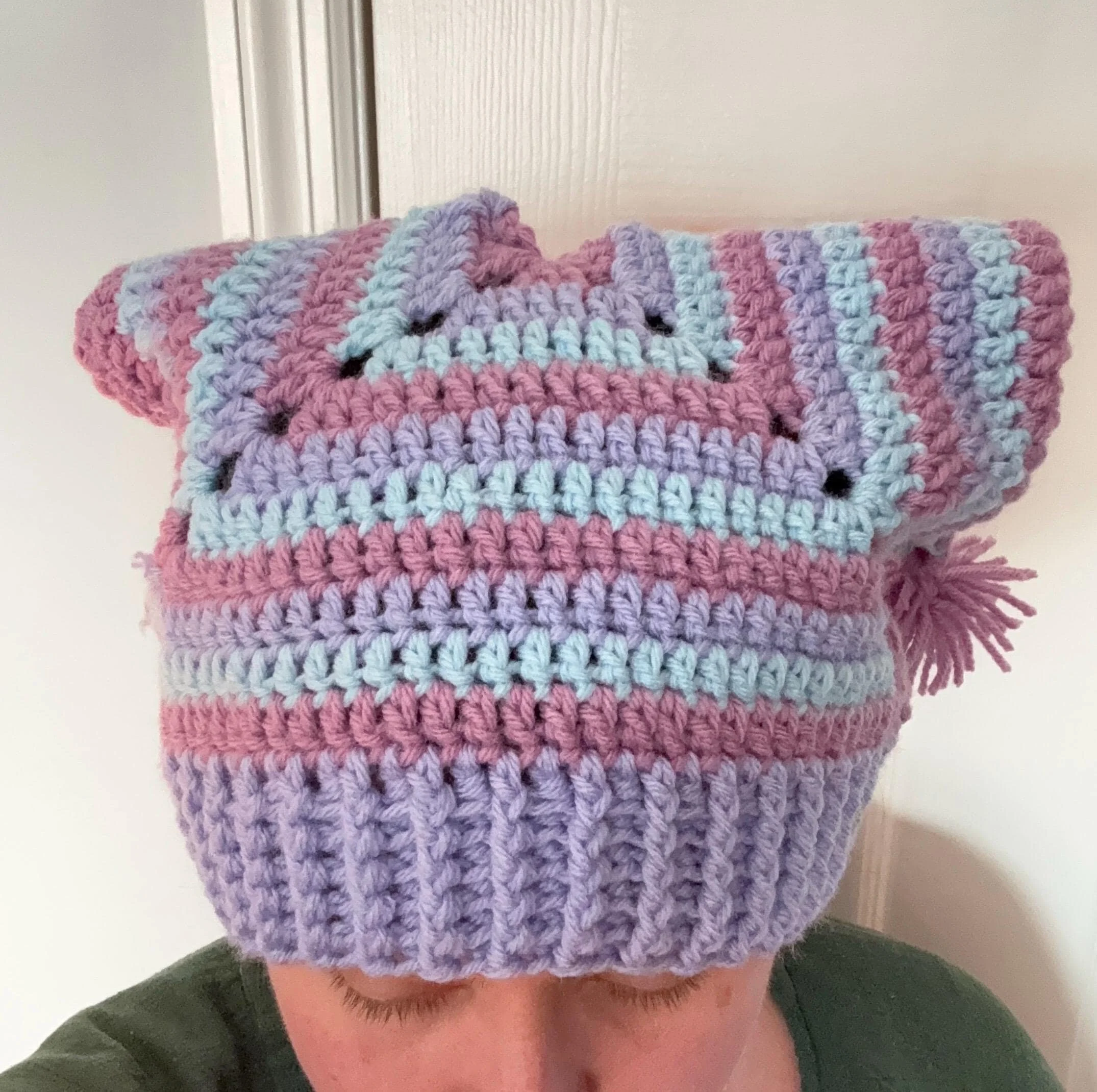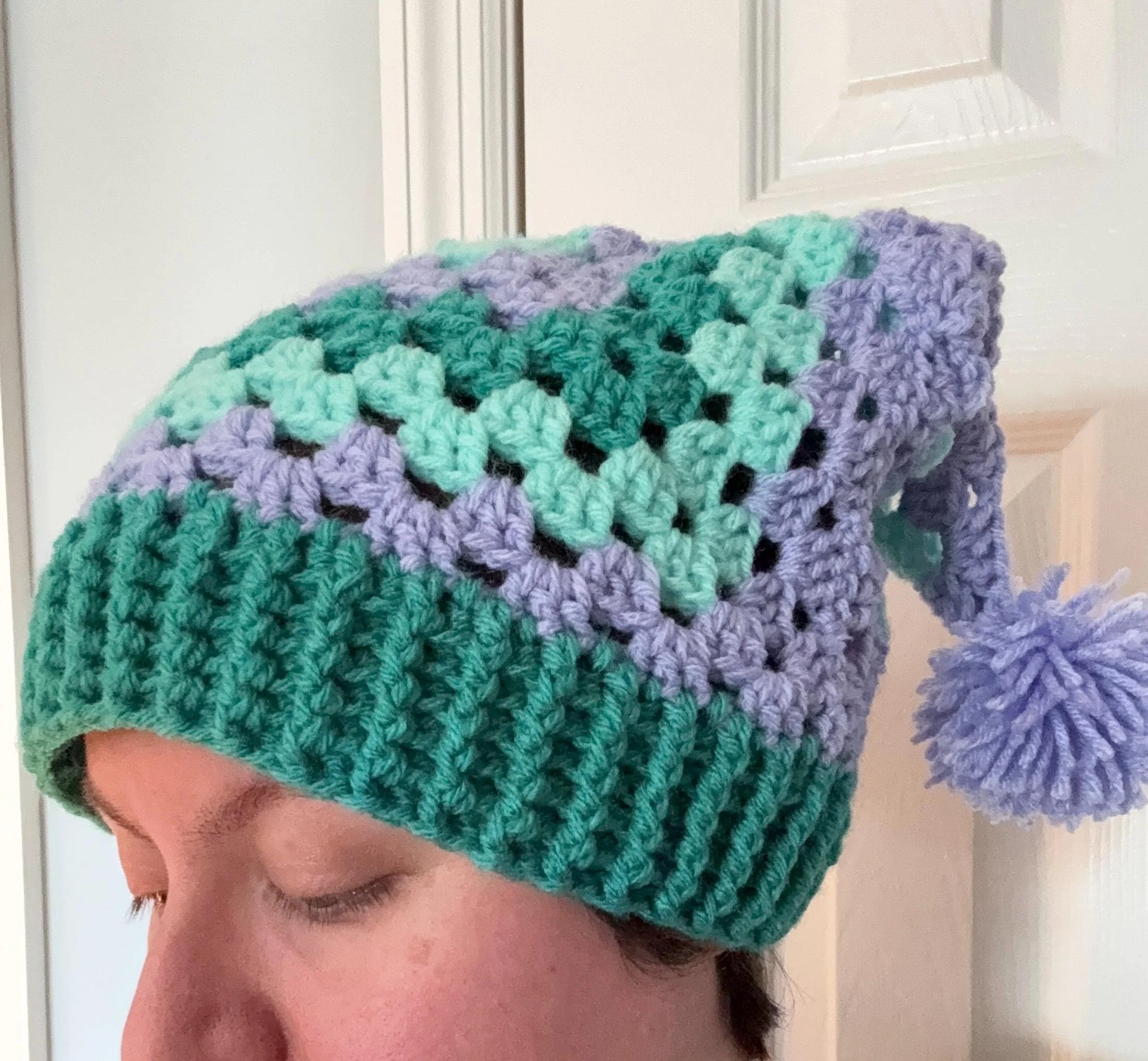 Each hat utilizes a different combination of colors and stitch patterns, making each one unique; customization is also available if you're looking for something in particular! To order a personalized hat, please select the "Custom Made" option and then list your hat's design features (for example: color, stripe pattern, pompoms, etc.)