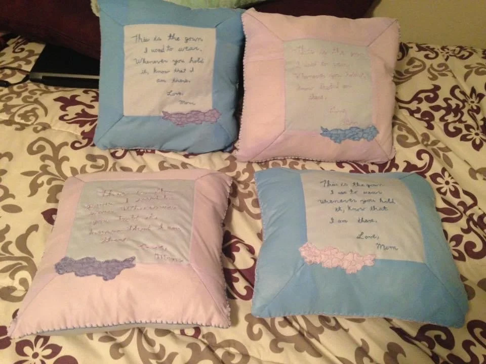 In the event that space is limited, memorial pillows offer a great solution to use only a little bit of material and space. For large families, multiple pillows can be made in a variety of sizes, and customized to a certain degree. This can help with the healing process by representing the uniting force of the love within one family.