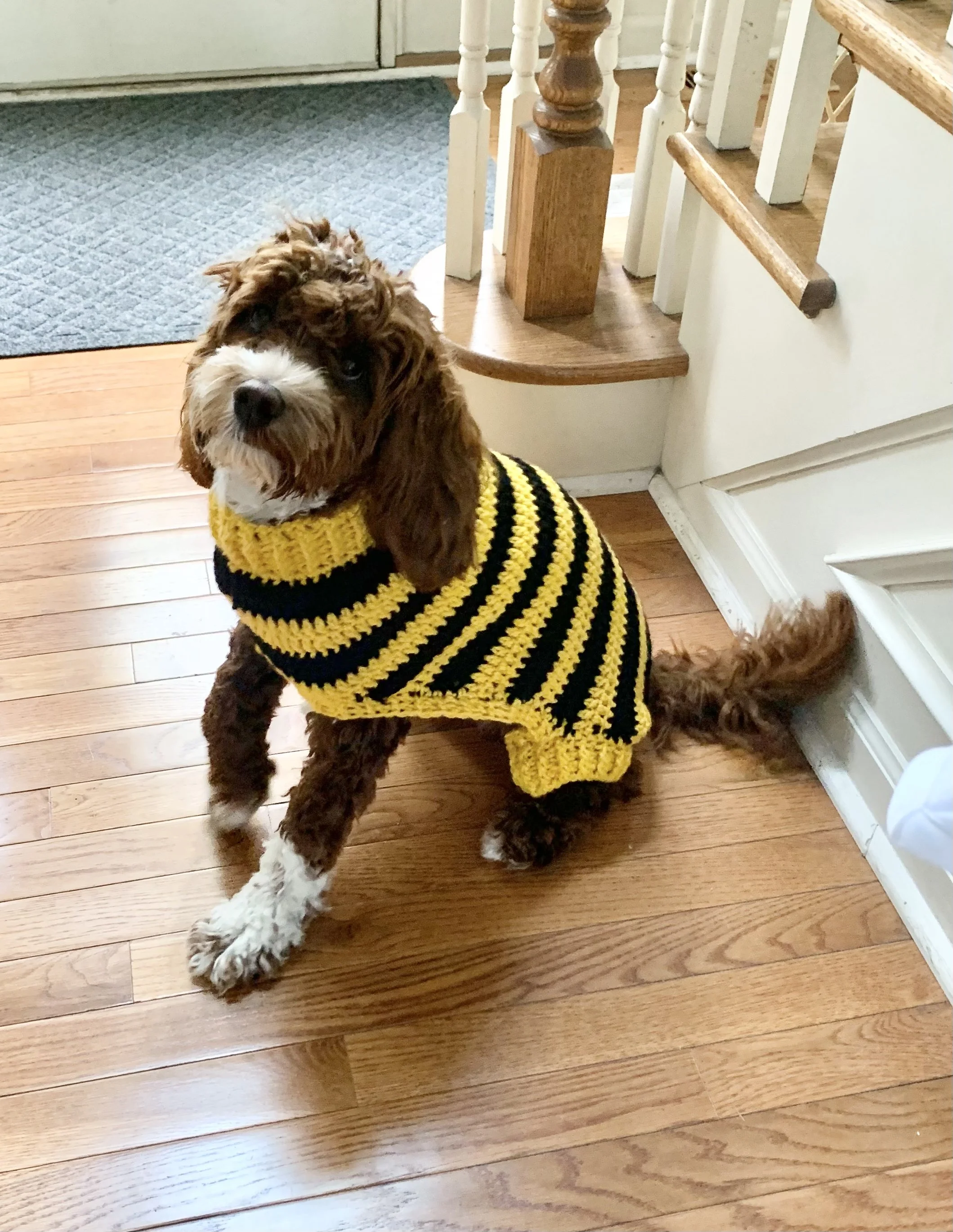 The ‘first-born’ sweater turned my puppers into a bumble-bee… but a very cute bumble-bee!