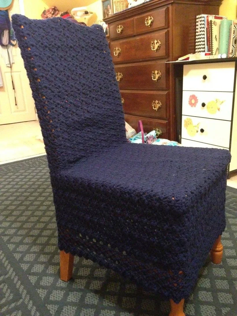 I discovered a relatively large roll of the leftover navy from years earlier... then I started eyeing the chair still sitting at my quilting station... and then I reasoned that I didn't have the rug to match it anymore (in fact, the cover didn't really match anything I now had decorating my home-studio)... and so, she became a cropped sweater! But I wasn’t too happy with the way she turned out…